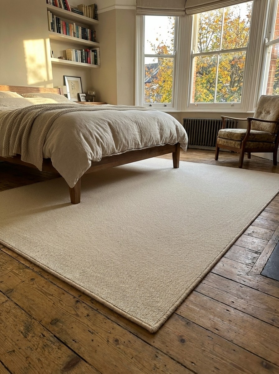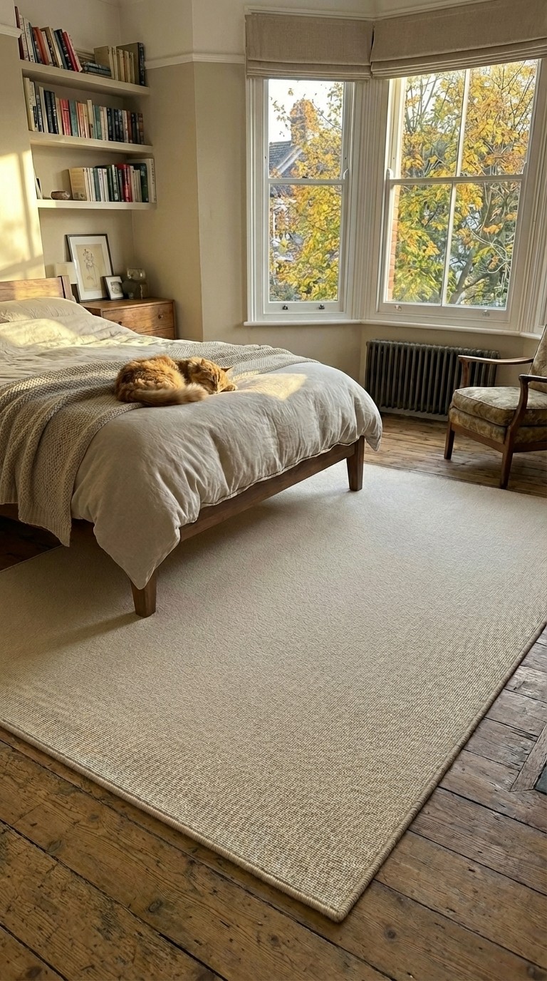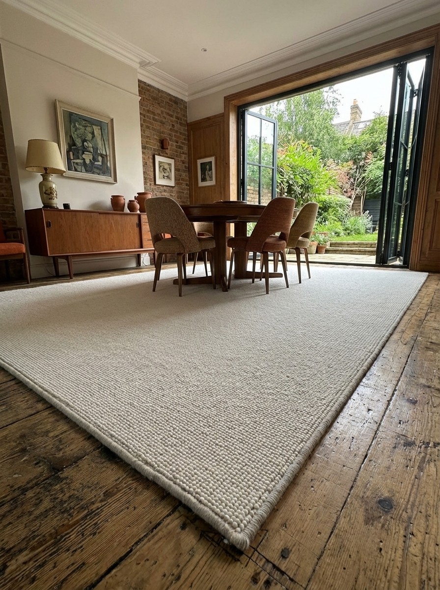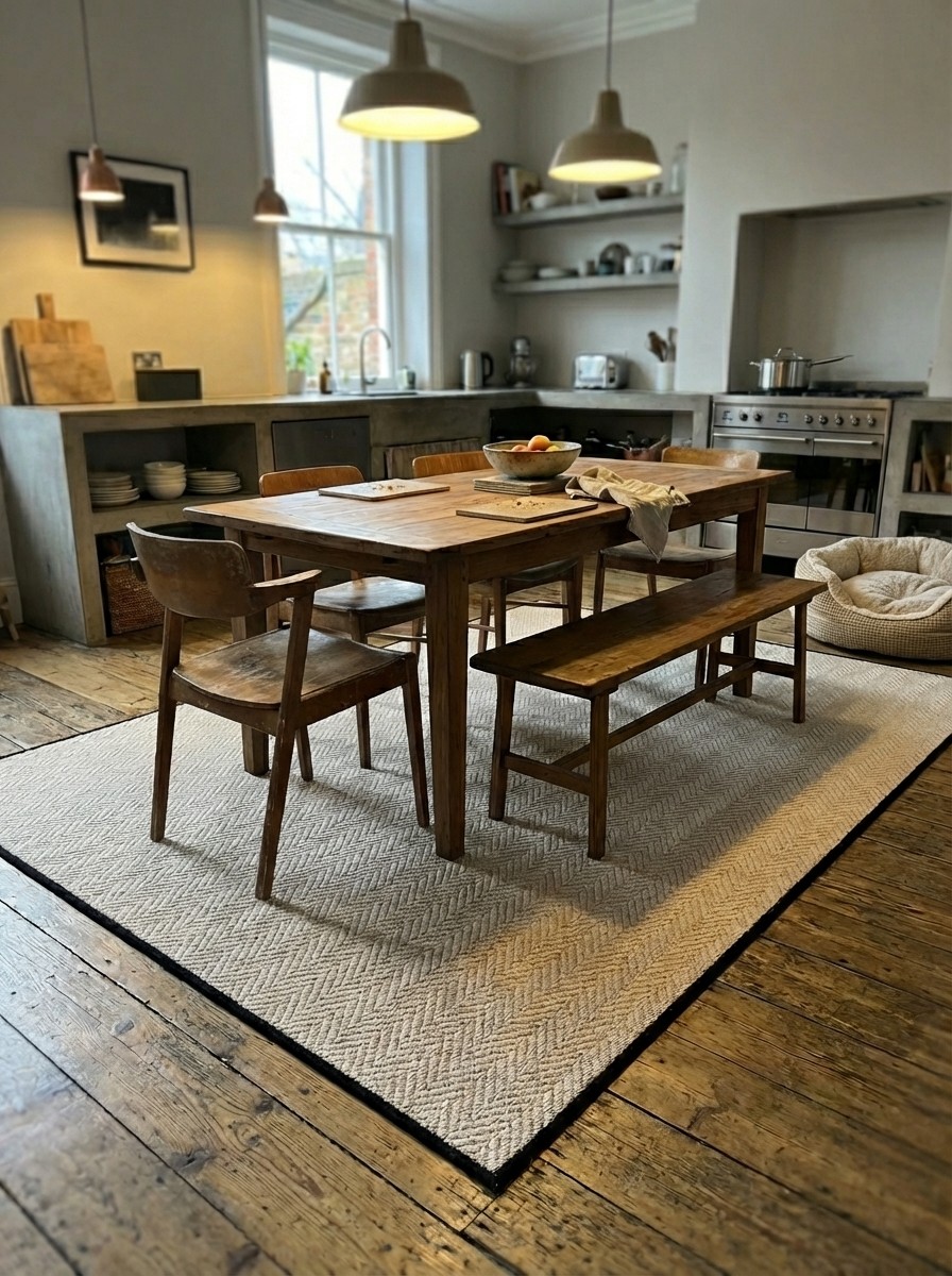 Using our composite workflow, we "built" a series of hyper-realistic interior environments, from rustic kitchens with concrete detailing to sunlit bedrooms featuring pets. We composited the real rug data into these generated scenes, ensuring the product texture and weave remained 100% accurate while the lighting and shadows interacted naturally with the environment.